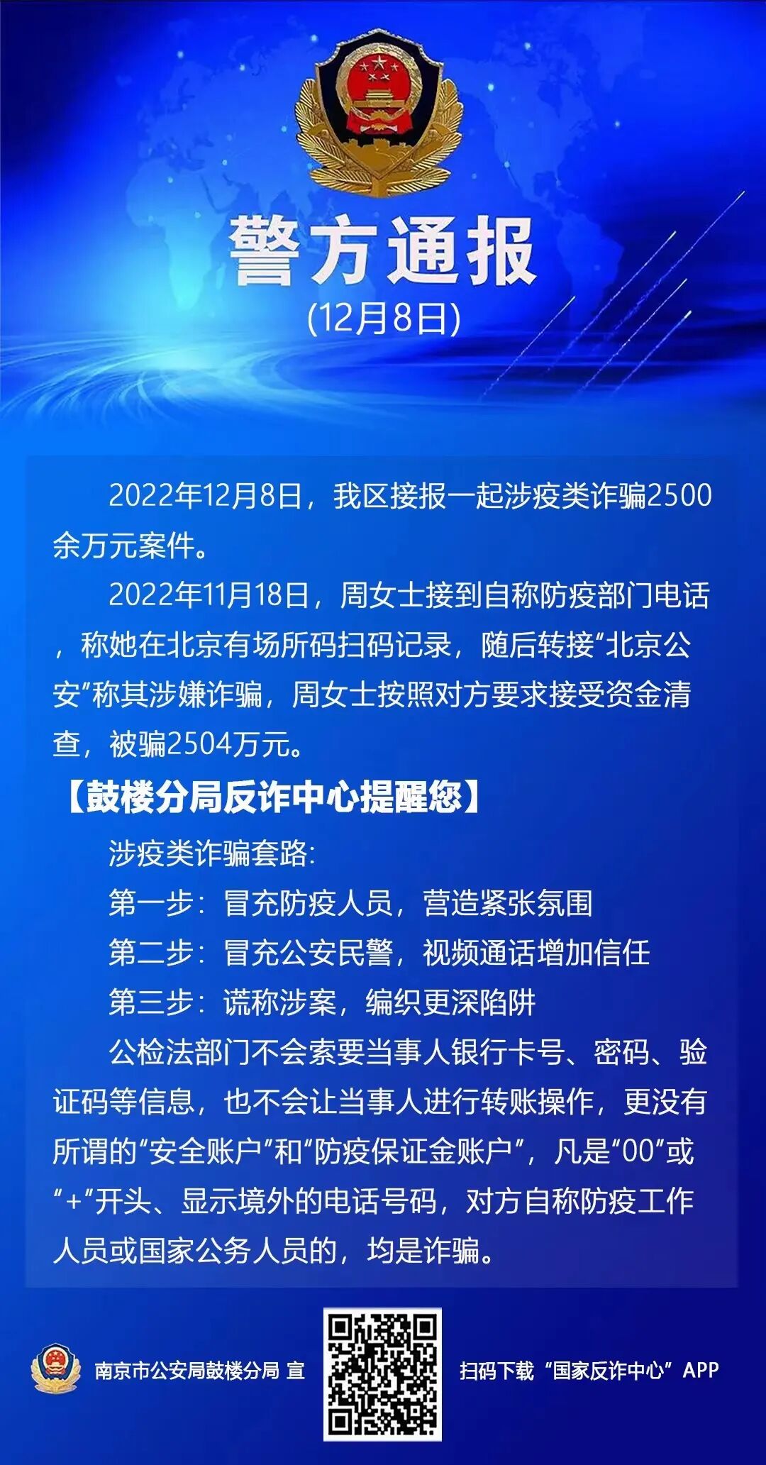 2022年12月8日,南京市公安局鼓楼分局发布一起涉疫类诈骗2500余万元案件。2022年11月18日,周女士接到自称防疫部门电话称她在北京有场所码扫码记录,随后转接“北京公安”称其涉嫌诈骗,周女士按照对方要求接受资金清查,被骗2504万元。