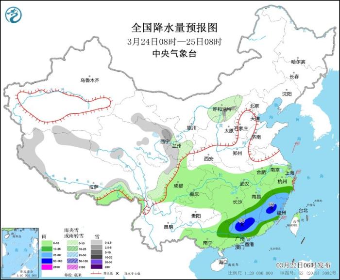 3月24日08时至25日08时,西藏西部、青海东部、甘肃南部、山西北部、川西高原北部等地的部分地区有小到中雪或雨夹雪。江南南部、华南中北部等地的部分地区有中到大雨,其中,江西南部、福建中部、广东北部等地部分地区有暴雨(50~90毫米)。黄海大部海域将有5~7级风、阵风8级,部分海域阵风可达9级。