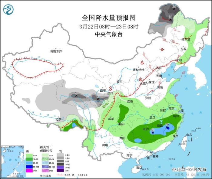 3月22日08时至23日08时,内蒙古东北部、黑龙江西北部、西藏东部、西北地区中部等地的部分地区有小到中雪,其中,内蒙古东北部、黑龙江西北部、青海南部等地的部分地区有大到暴雪(10~18毫米)。西藏东南部、江南中南部、贵州东南部、广西东北部等地的部分地区有中到大雨,局部有暴雨(50~70毫米)。内蒙古中东部、东北地区西部、华北等地的部分地区有4~6级风,其中,内蒙古东北部等地部分地区有6~7级风。